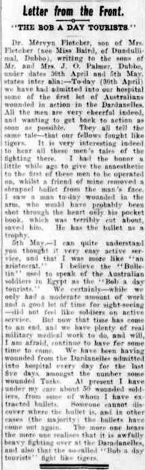 Letter from the front "The bob-a-day Tourists" by W.M.A. Fletcher, The Dubbo Liberal, 22 June 1915 [ JPG ]