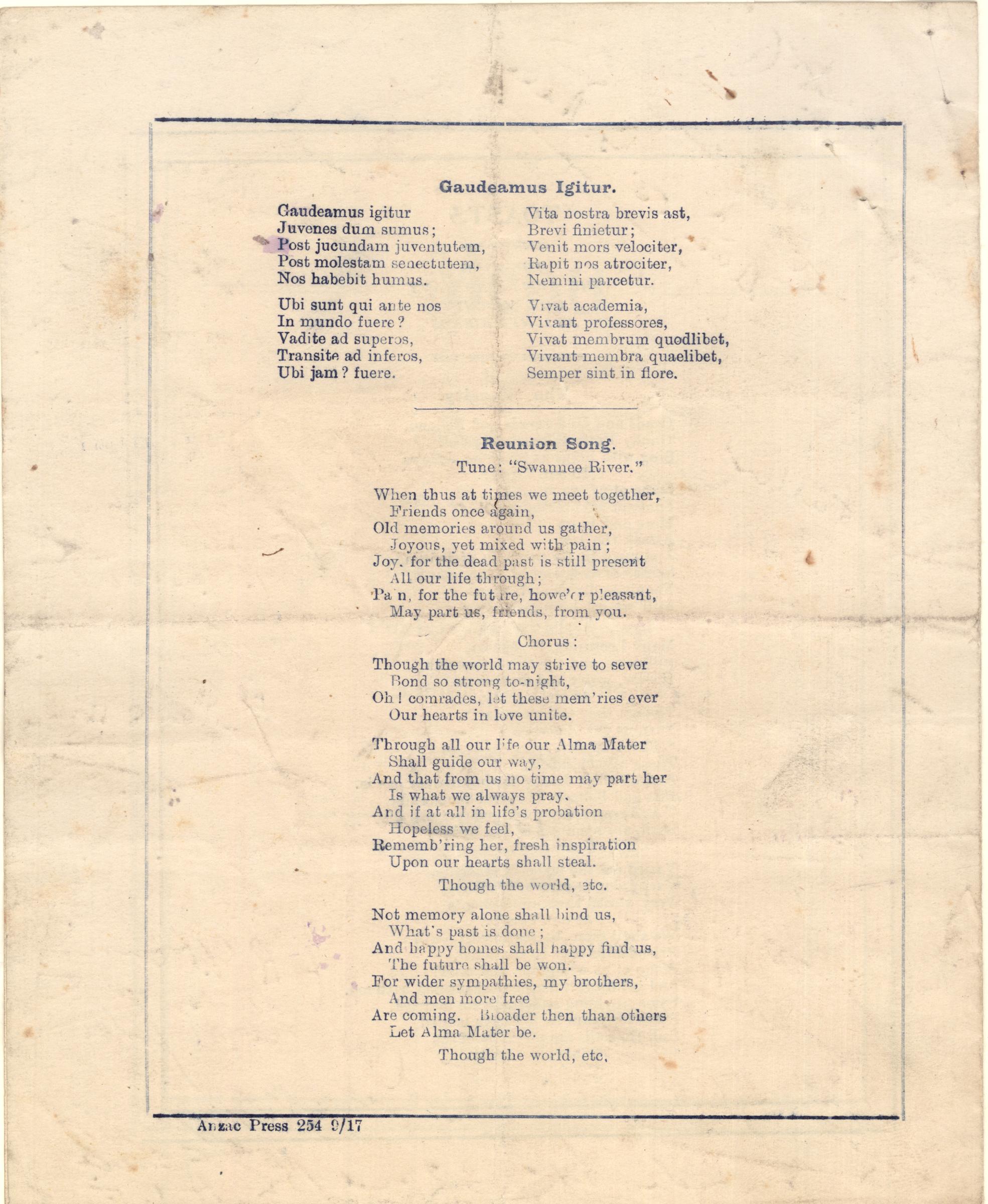 Back page of Reunion DInner menu/prgram 5 September 1917
