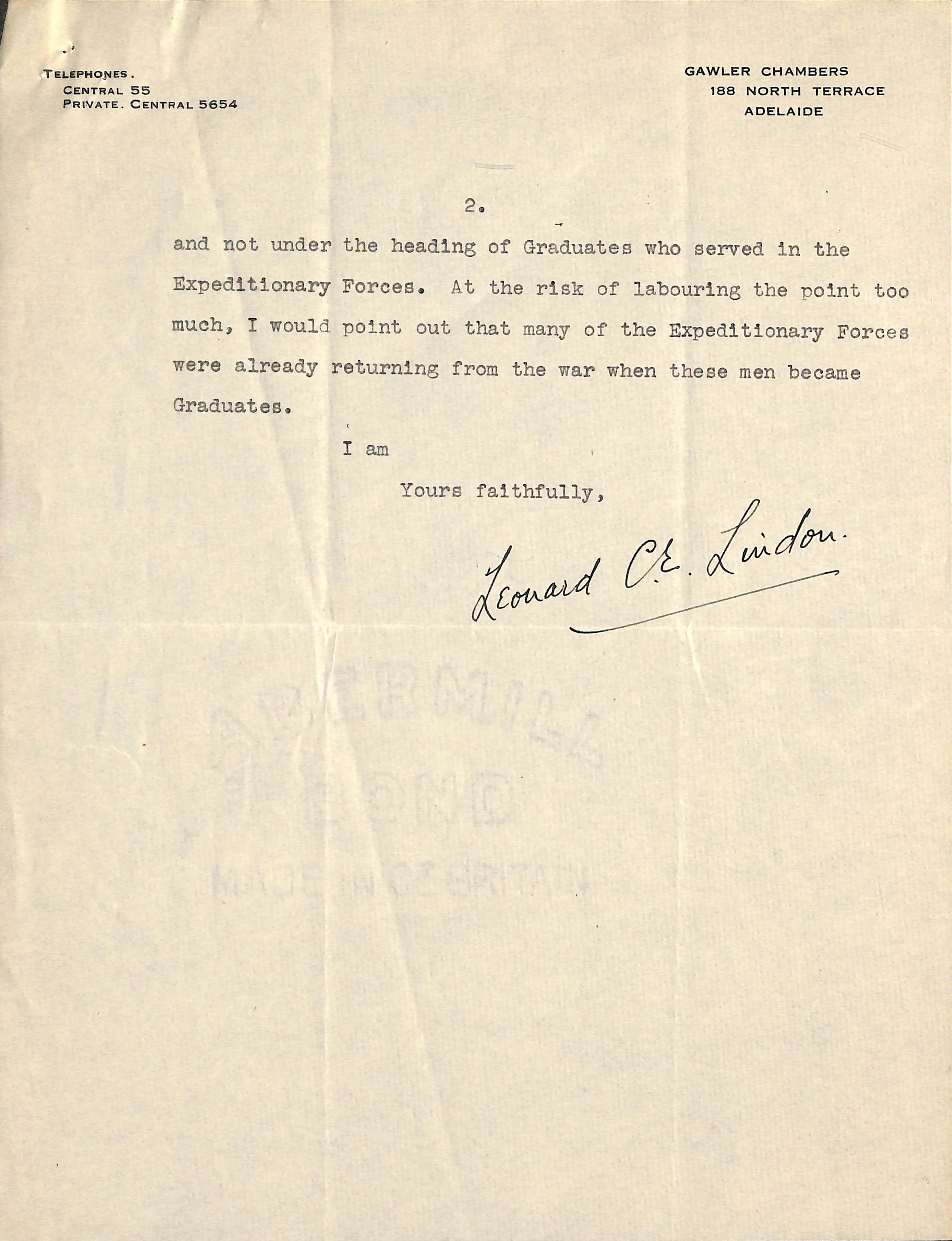 Letter from LCE Lindon to the Adelaide University Registrar Part 2