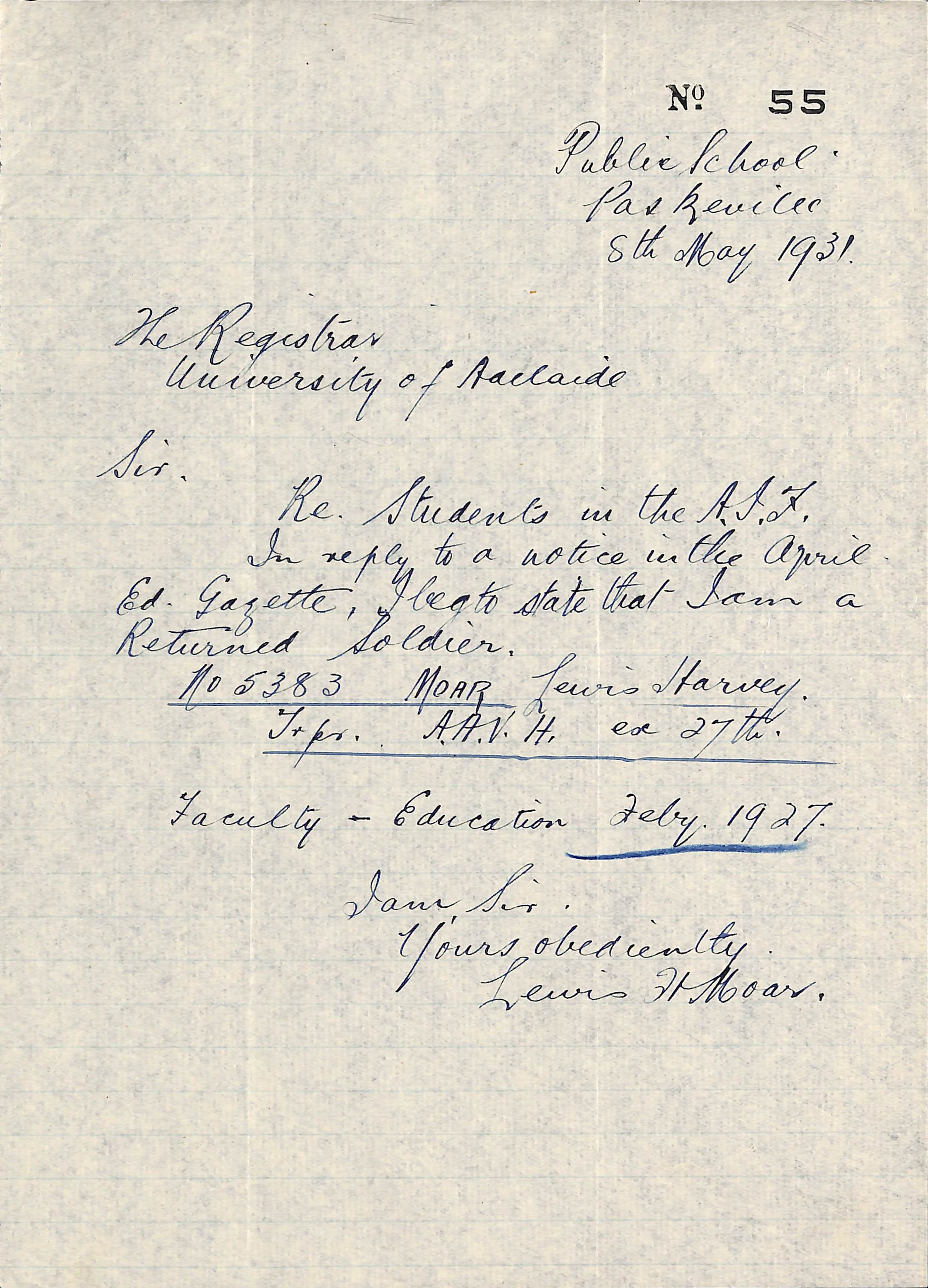 Letter from LH Moar to the Adelaide University Registrar