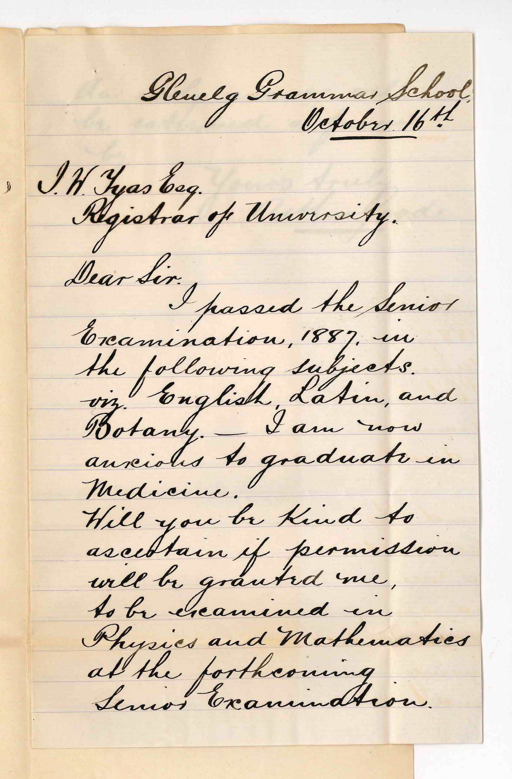 Letter from Arthur Goode to Adelaide University Registrar asking for permission to be examined in Physics & Mathematics at "forthcoming Senior Examination" for admission to Medical Course, October 1888.